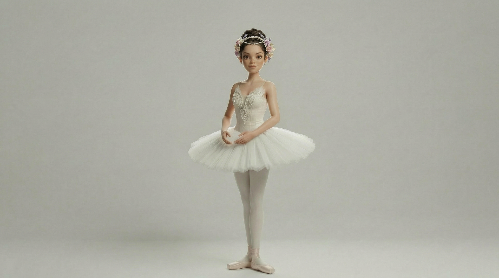 Wearing a classical tutu, bodice, pointe shoes and a Waltz of the Flowers head piece.